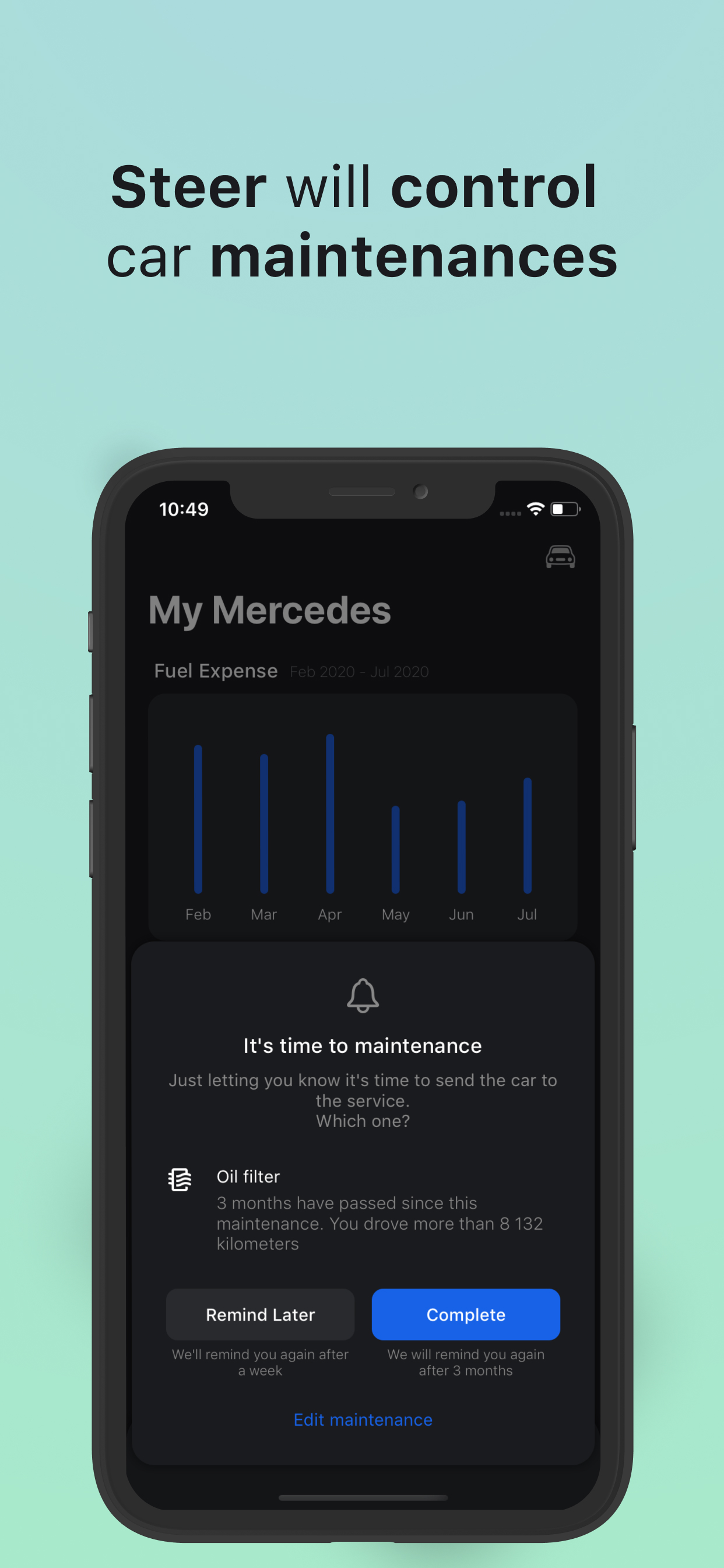 您可以在Steer应用程序中存储换油,轮胎服务,滤清器,制动检查以及许多其他服务。您可以指定价格,通道的里程表,日期,然后选择要再次通过维护的公里数或时间