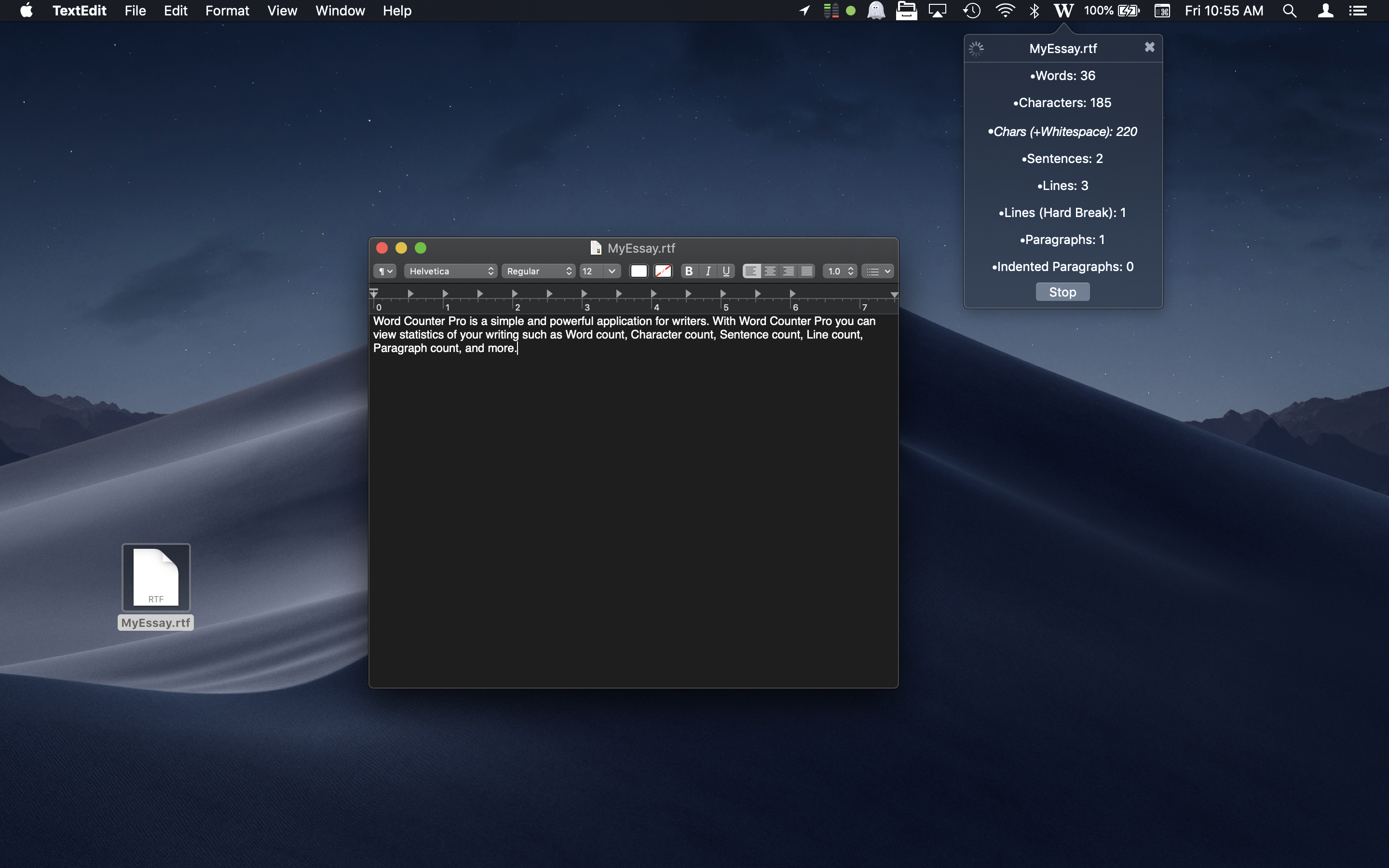 3. 您可以让 Word Counter Pro 在您通过其他应用进行编辑时同步查看支持格式的文本文件。当 Word Counter Pro 正在查看文本文件时,菜单栏中将出现一个弹出式窗口,显示随您书写内容而不断更新的统计数据。