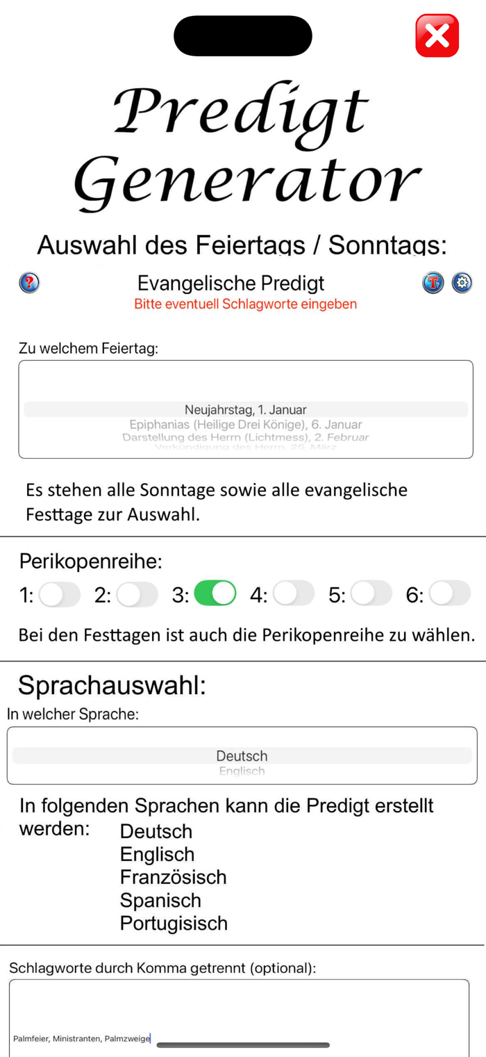 这款应用可创建福音教会年特定周日和节日的布道内容,提供适配不同礼拜场合的定制文本。具备文本转语音功能方便朗读,分享功能能让布道通过邮件、社交媒体等平台传播。支持德语、英语、法语、西班牙语和葡萄牙语等多语言,适合神职人员、普通信徒或任何想传播信仰信息的人,主要功能包括为周日和节日创建布道、文本转语音朗读、多渠道分享布道,有多语言版本。