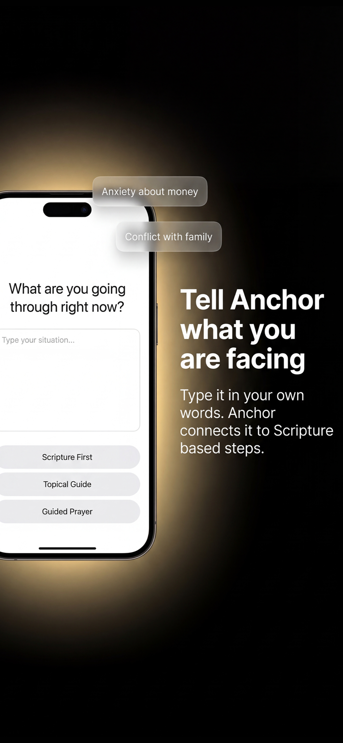 You share what you are going through, and Anchor surfaces verses and practical, Bible based steps that fit your situation. Each session helps you slow down, hear God’s Word clearly, and respond with simple actions you can take today.