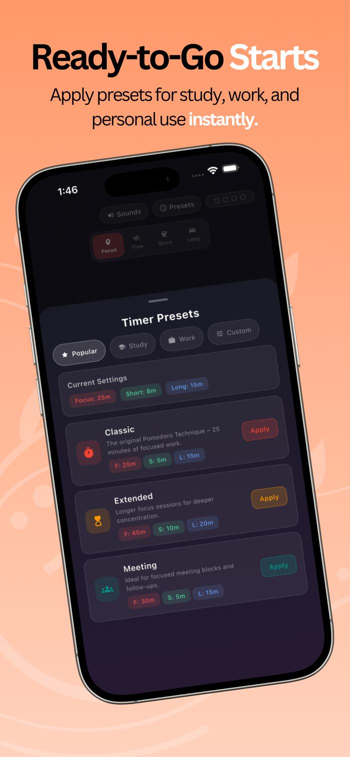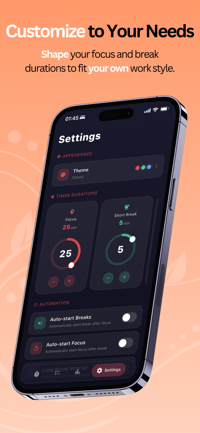 Customize all durations to suit your needs — focus sessions can be set from 1–60 minutes, short breaks from 1–30 minutes, and long breaks from 5–60 minutes.