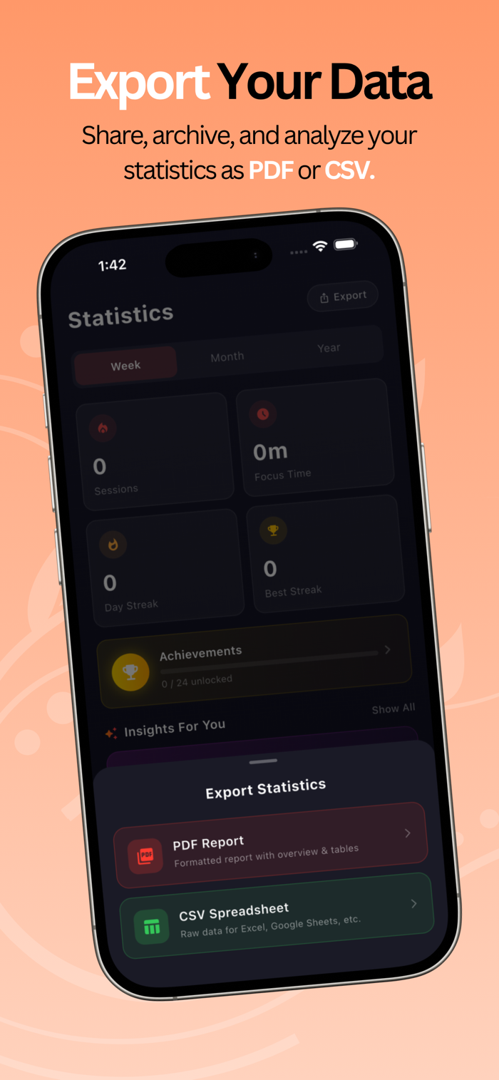 • Special — Early Bird (before 7:00 AM), Night Owl (after 11:00 PM), Ultra Focus (120+ min sessions)
