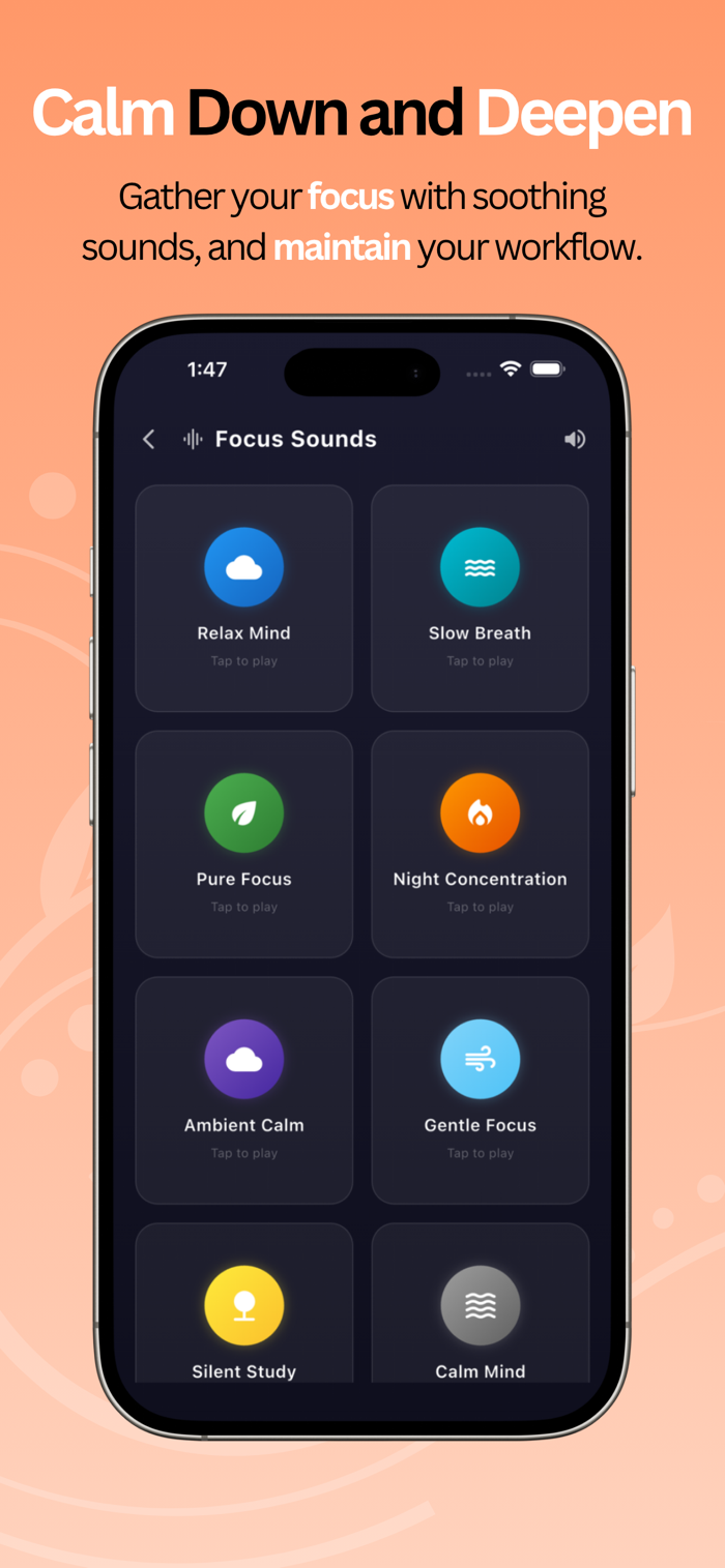 Relax Mind, Pure Focus, Night Concentration, Deep Focus, and more. Boost your focus with ambient sounds playing in the background. Adjust the volume to your liking.
