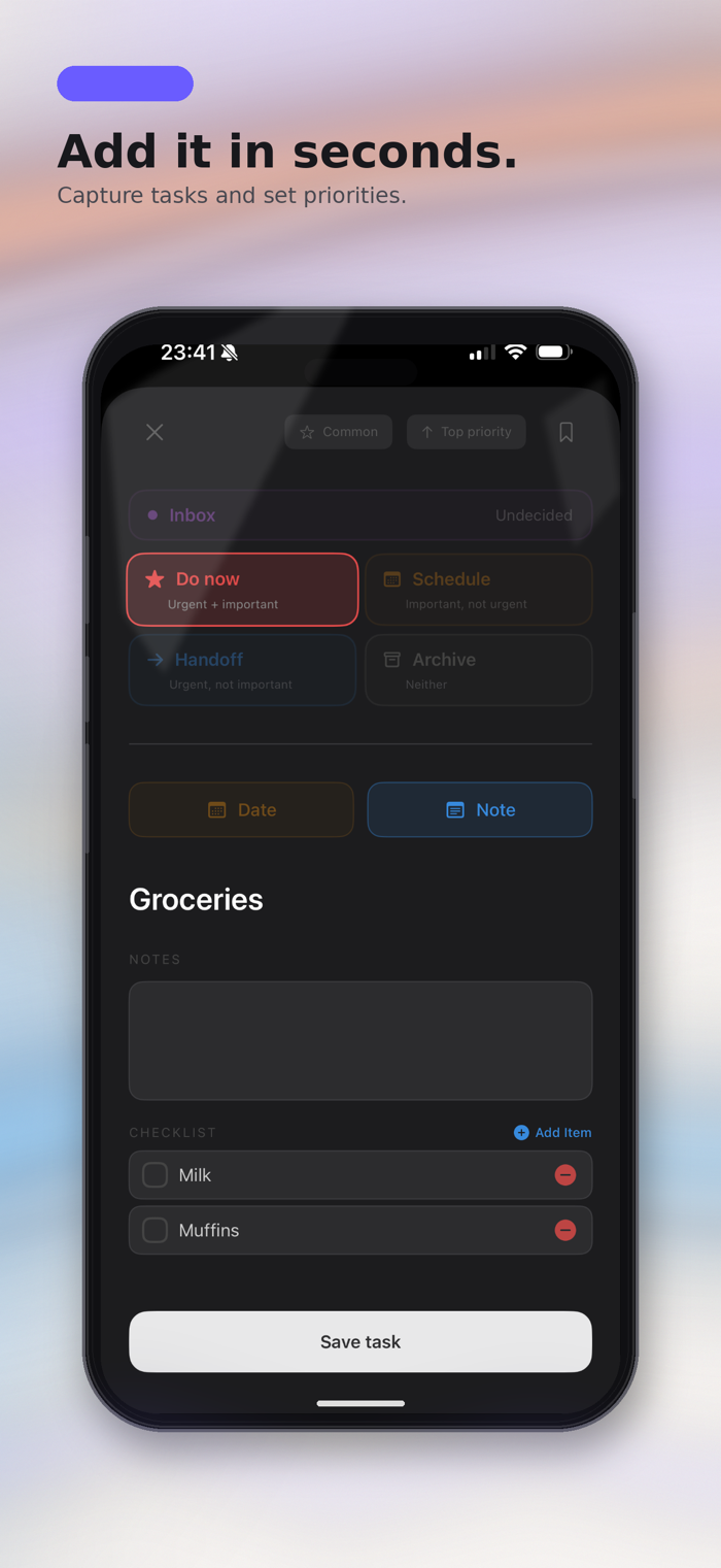 一种直观且快速的任务优先级排序和组织方式。旨在通过简单的艾森豪威尔矩阵工作流程减少思维混乱。