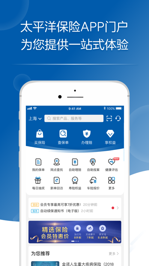 【一站式权益服务】整合太平洋保险集团旗下太平洋产险、太平洋寿险、太平洋健康险、长江养老等子公司权益服务,用户可在APP享受高效便捷的一站式服务