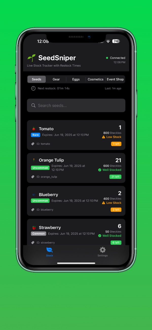 SeedSniper是“Grow A Garden”游戏玩家必备工具,可实时追踪种子、装备、鸡蛋、化妆品及活动物品库存,有实时补货倒计时、价格追踪与可用性状态,支持搜索排序。能提供智能通知,物品补货即时提醒,有背景通知、分类通知及测试通知系统。还有专业版功能,如自定义稀有度过滤、优先提醒、高级通知定制,助玩家抢先获取稀有种子,节省手动检查时间,不错过限时活动物品。