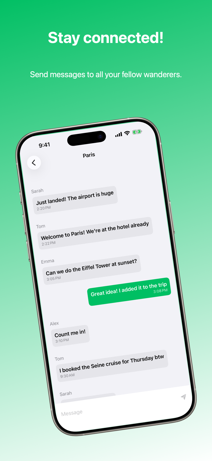2. Real-time Chat: Stay in touch with your travel buddies with our chat functionality. Whether you're coordinating plans, sharing updates, or just chatting about your day, our integrated chat keeps your group connected and informed, enhancing your travel experience.