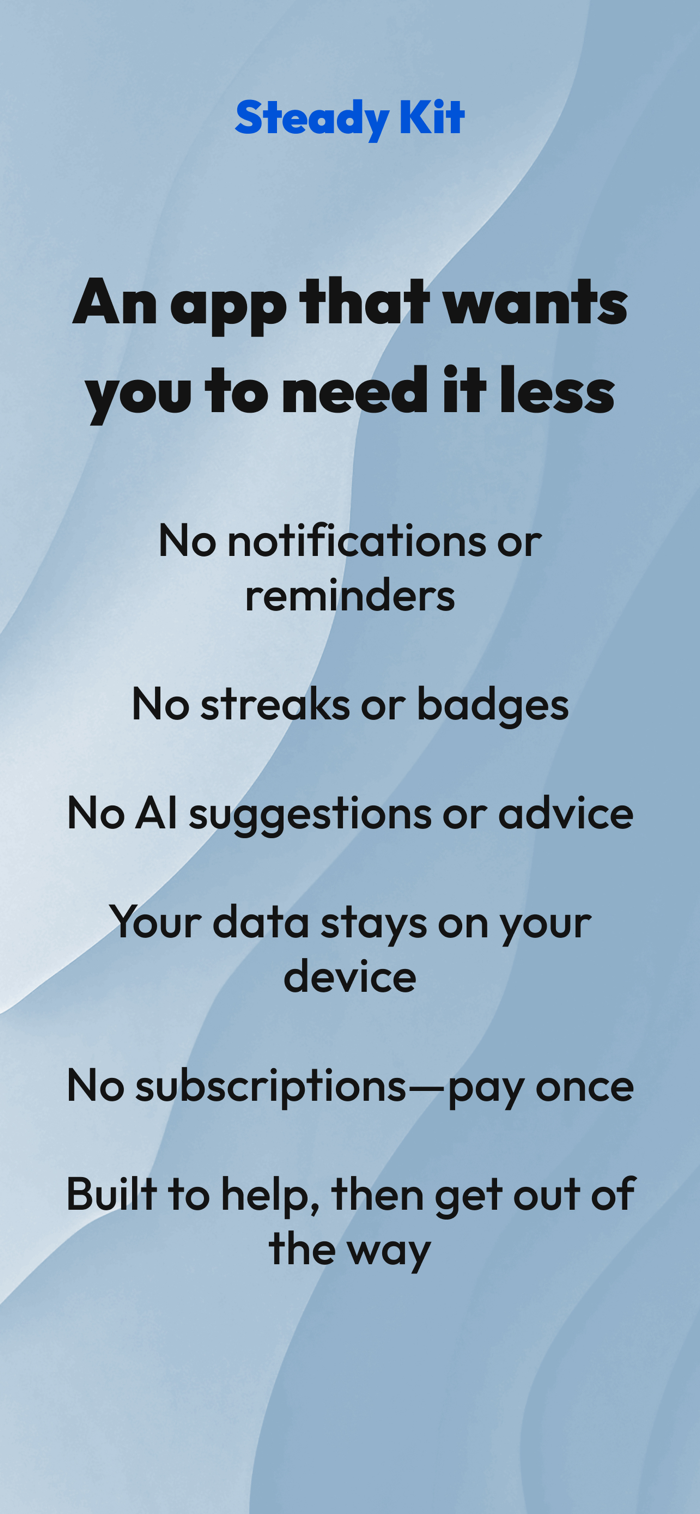 Steadykit是一款可自行创建的个人行动手册。能针对焦虑、压力大等艰难时刻创建循序渐进的序列。其工作原理是为不同情绪状态创建个性化序列,序列含过去有效的行动、短语或媒体等。有文本短语、行动清单等七种步骤类型。当遇到困难,打开应用,点击当前情绪状态,遵循预先创建的序列即可。