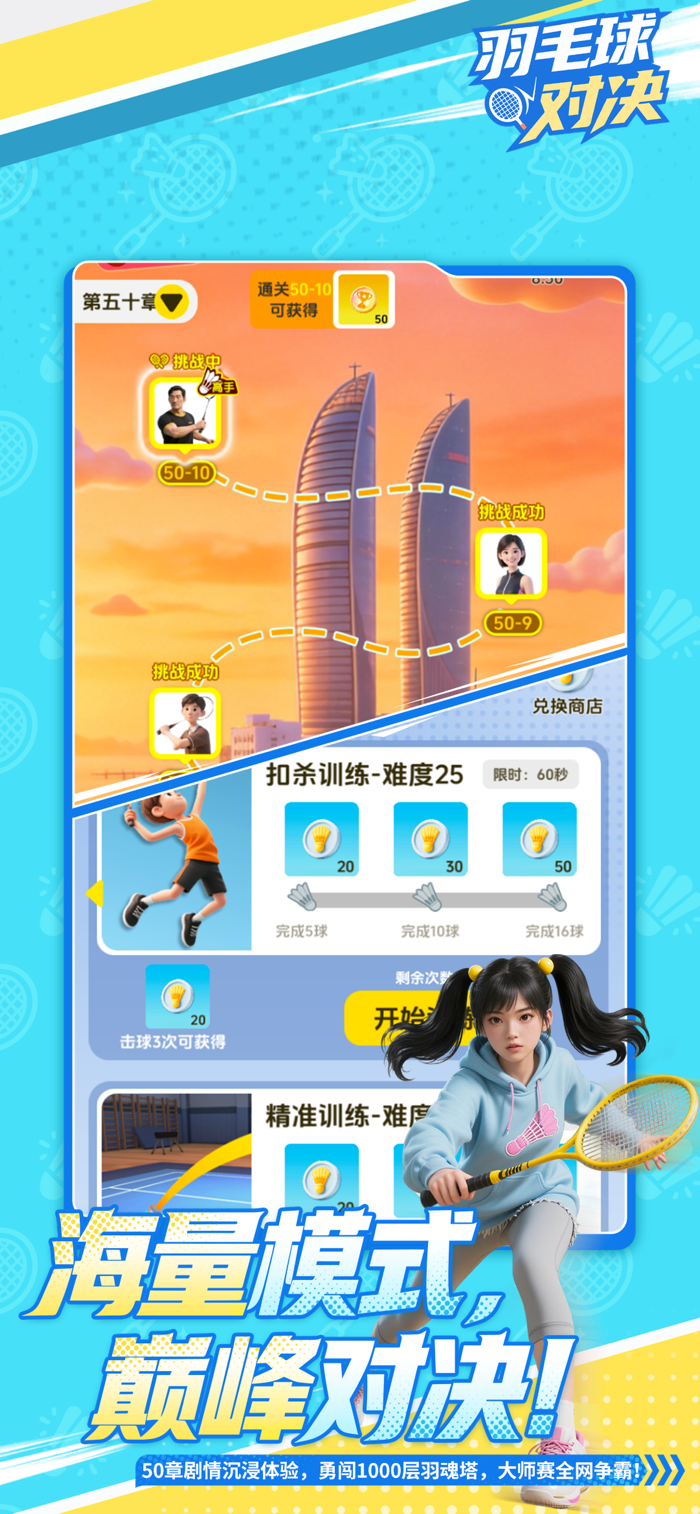 《羽毛球对决》是竖屏游戏,契合碎片化娱乐需求,单局 1 - 3 分钟。操作极简,通过滑动、点击完成专业击球动作,内置新手引导易上手。游戏中玩家控制击球方向力度应对对手,考验多种能力,提升技术获成就感。还设有丰富奖励系统,赢比赛等可获金币道具解锁新内容,提升趣味性与可玩性。