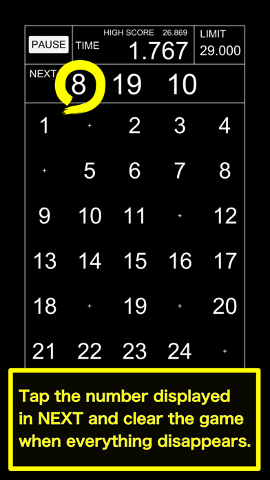 这是一款挑战速度的游戏,通过点击“NEXT”显示的数字,清除所有内容。游戏设定时间限制,只有在此时间内完成才能进入下一阶段。游戏模式分为“NORMAL”和“HARD”,前者数字按顺序排列,易于寻找;后者数字随机排列,难度更高。一旦完成“NORMAL”,即可解锁“HARD”模式。