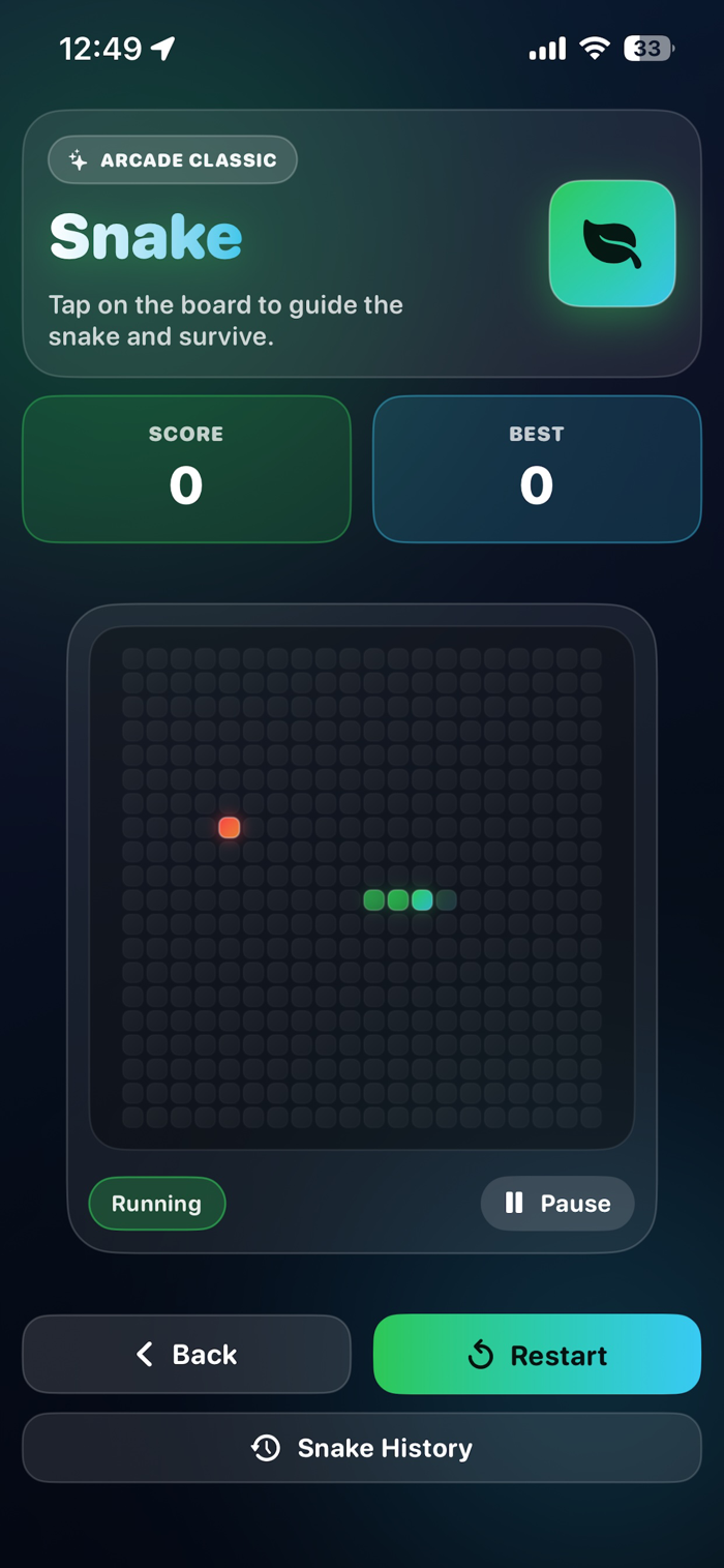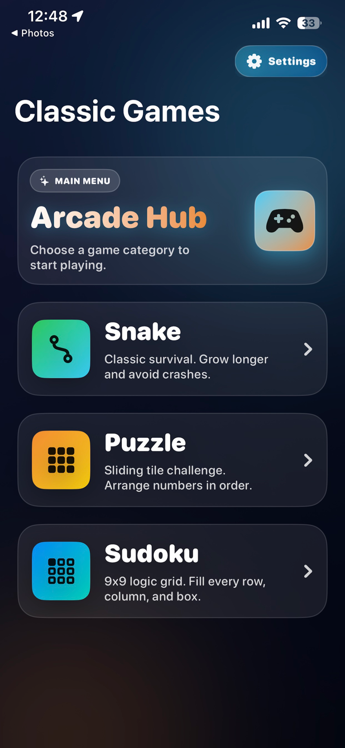 Play five timeless games in one beautifully designed app: Snake, Puzzle, Sudoku, Tic-Tac-Toe, and Tetris.