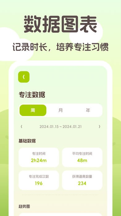 4. 专注数据。提供详细丰富的专注数据图表和已获得道具汇总,看看这周的专注获得了多少橘子